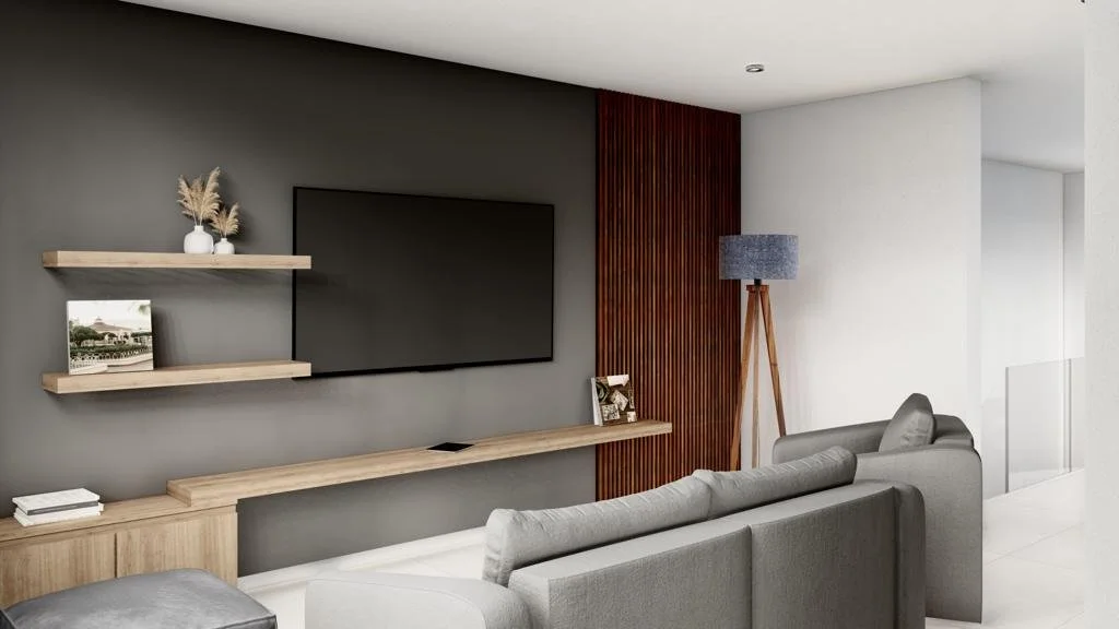 La planta alta distribuye 4 recámaras y un estar de tv a través de un distribuidor que mantiene al frente la recámara principal, frente a ella una recámara secundaria con conexión a terraza y retomando el distribuidor encontramos el Estar de tv, dirigiéndonos al fondo del pasillo con dos recamaras que comparte un cuarto de baño con el Estar.