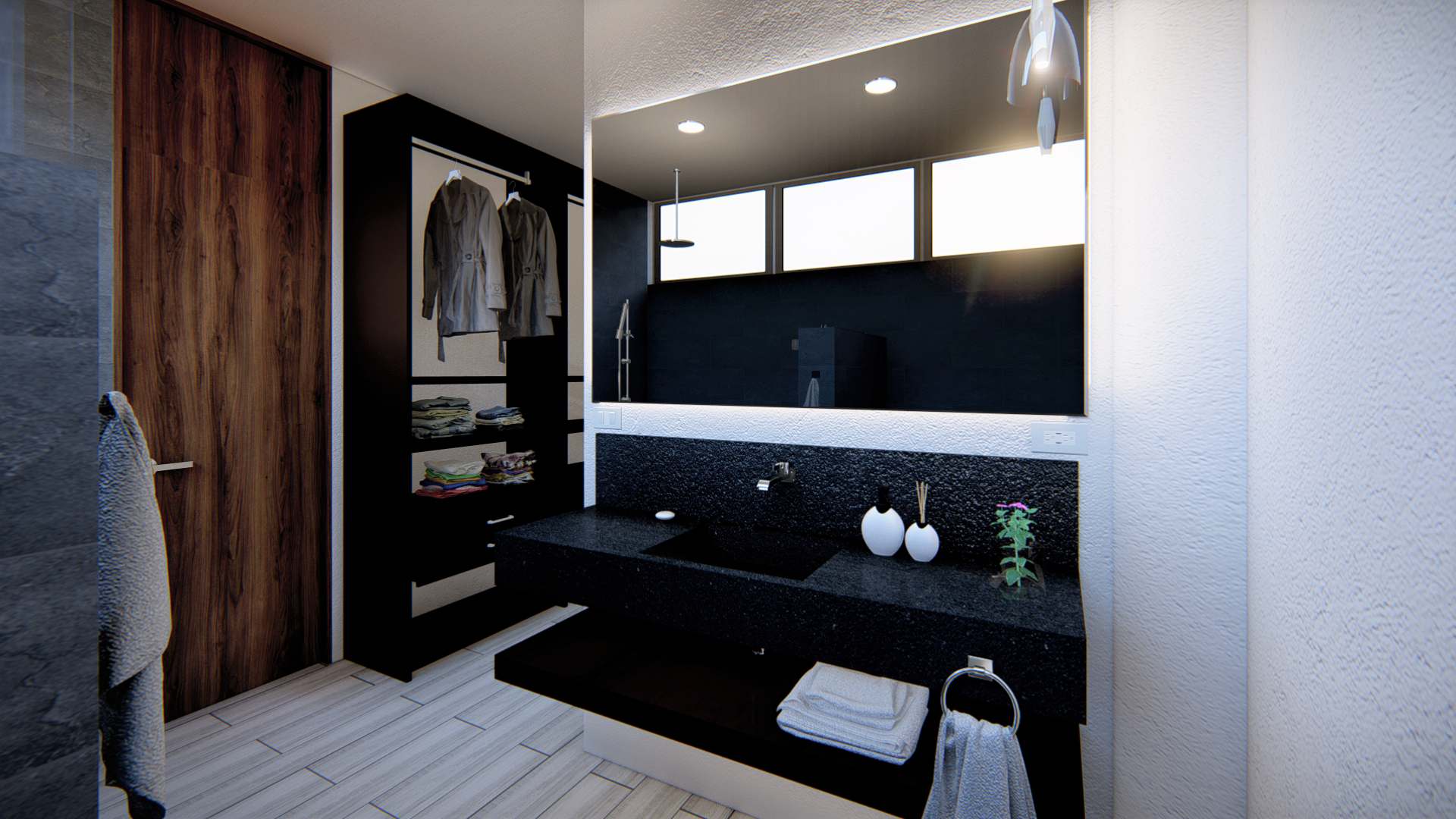 Una mezcla entre contemporáneo e industrial son los protagonistas de este proyecto. Acabados en madera, acero en negro y un diseño de cantera simulando muros de concreto son presenten dentro y fuera de esta residencia.